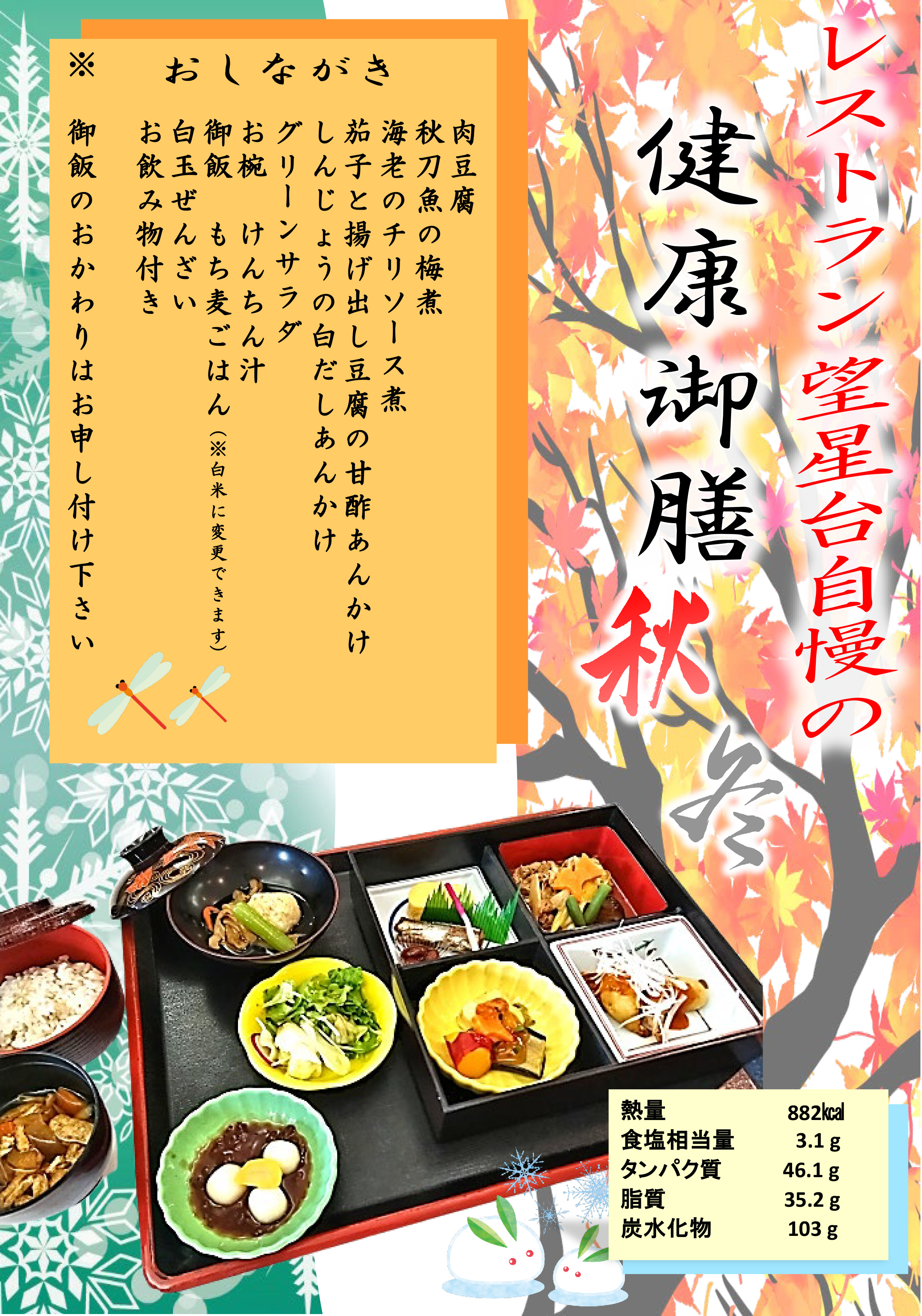 当センターでお出しする健康御膳は、「地域住民の健康増進と疾病予防を支援します」という当院の基本方針に則り、皆さまの健康を第一に献立を考えております。季節の食材を中心に数多くの品目をバランスよく取り入れながら、摂取カロリーや塩分を抑えた献立となっております。ぜひご賞味ください。